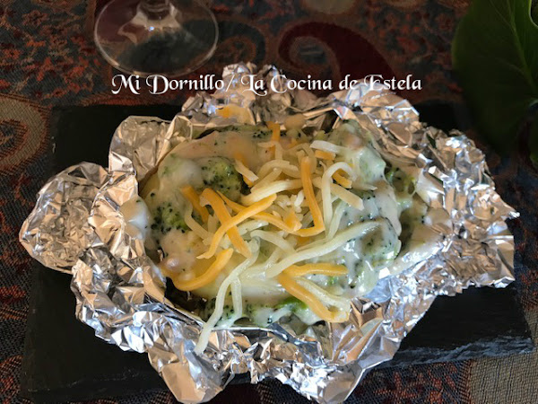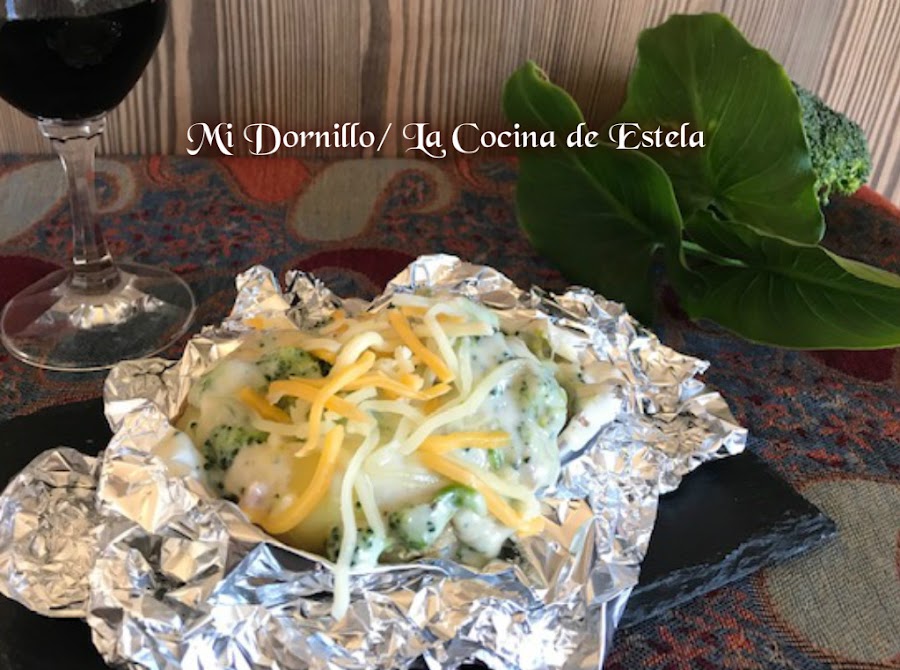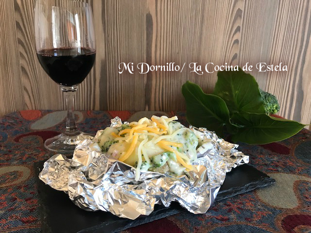 Cuando estén las patatas, abrimos el papel aluminio, y hacemos hueco en la patata para añadirle la salsa de brócoli y quesos, espolvorear con un poco de los quesos rallados.