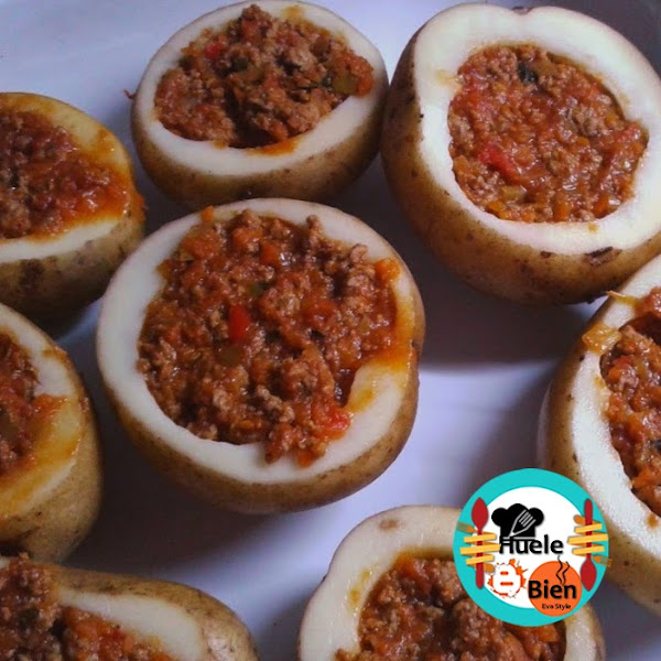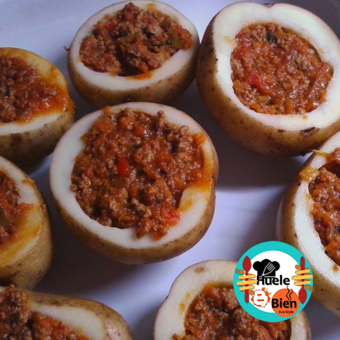 3.- Lavamos bien las patatas. Cortamos una cara de cada una. Con un sacabolas para frutas y verduras, extraemos el relleno, esté, (lo ponemos en remojo con agua). Rellenamos las patatas con la salsa boloñesa.