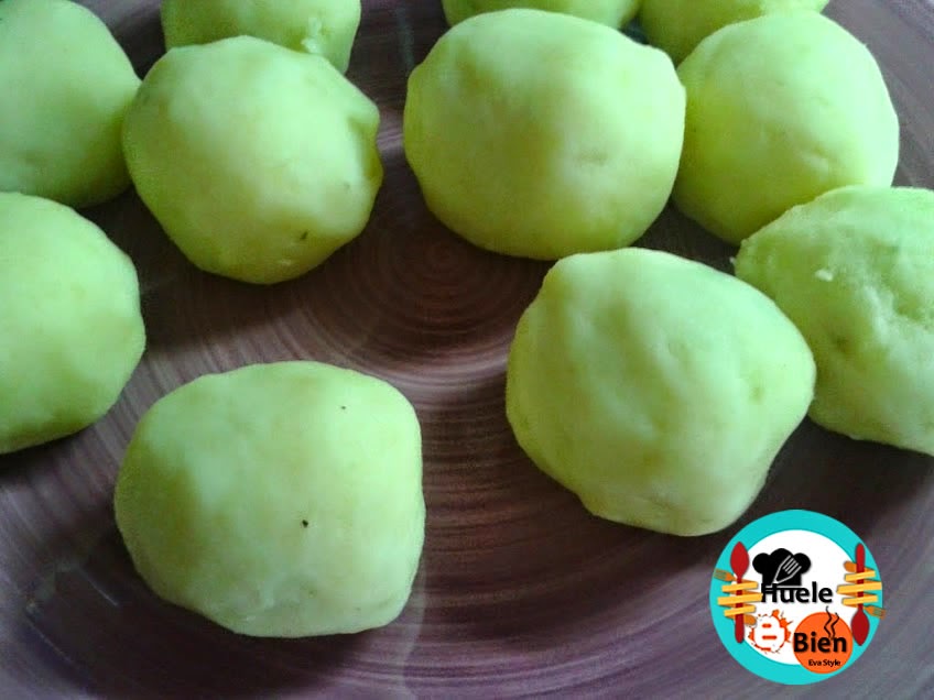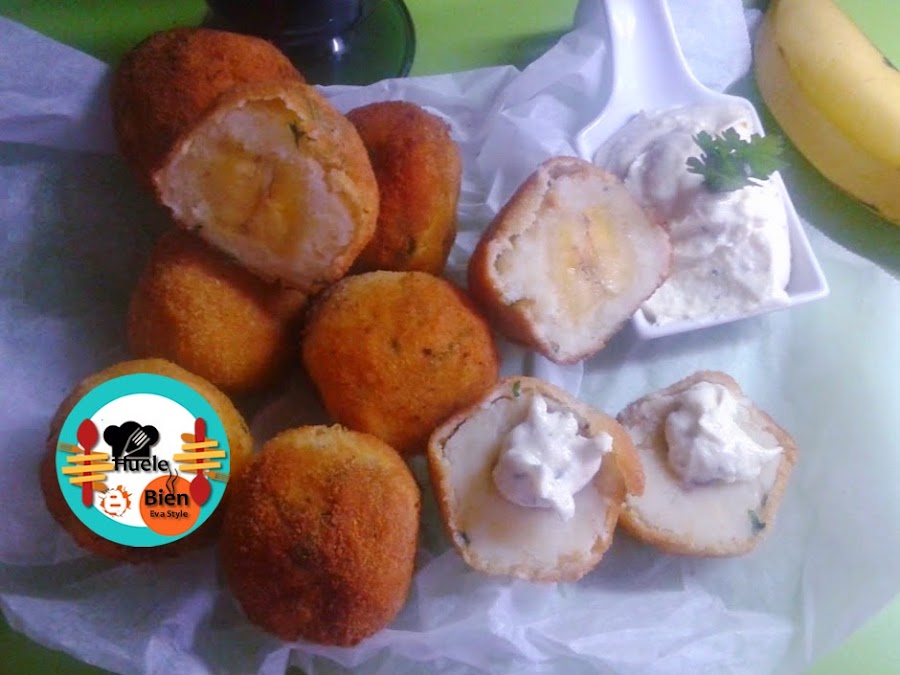 Bolas de patatas rellenas de plátano frito. Son perecidas a las patatas bomba.