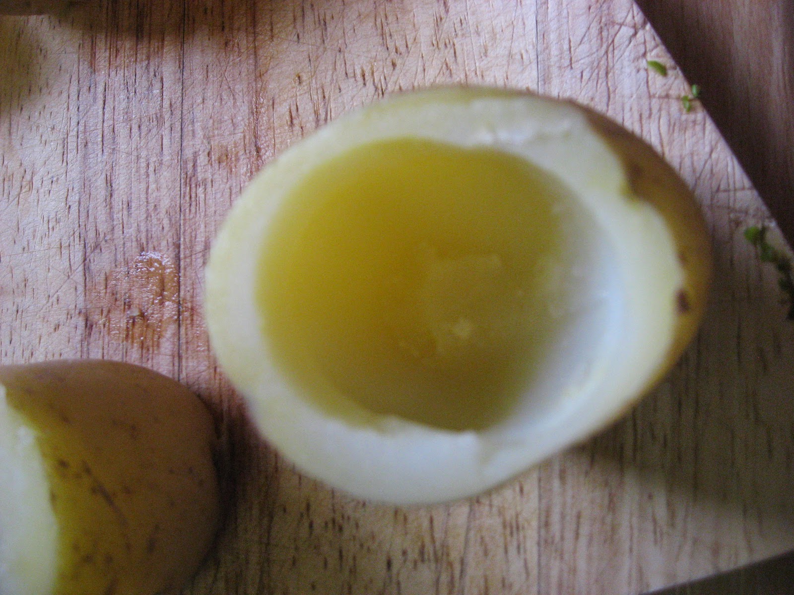 4º " Retiramos las patatas y le cortamos los extremos, las vaciamos con la ayuda de un aparato de los de hacer bolas de melón. Seguidamente las rellenamos con los espárragos, los champiñones y el jamón, pero antes en cada una de las patatas le habremos puesto en su interior una cucharadita de Al i oli.