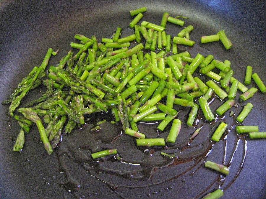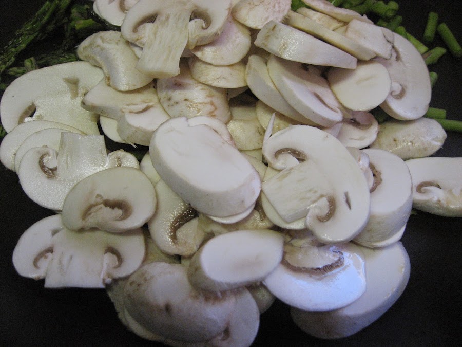2º " Cortamos los espárragos trigueros y los colocamos en la sartén, con un poco de aceite. Al mismo tiempo le añadimos los champiñones, que previamente habremos limpiado, dejamos que se hagan, sin pasarnos, cuando comiencen los champiñones a coger color le echamos el jamón que habremos cortado a tiras, un par de vueltas en la sartén y listo.