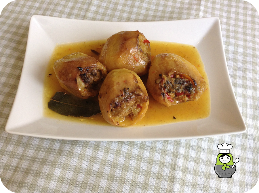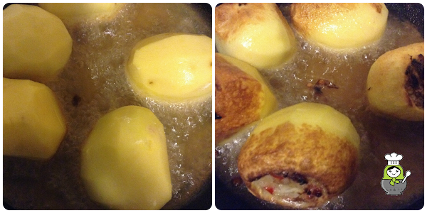 En una sartén con aceite, freímos las patatas ligeramente, empezando por la zona donde está el relleno y girándolas en un segundo momento. Cuando tengamos todas las patatas listas, las colocamos en una tartera no muy alta junto con las hojas de laurel.