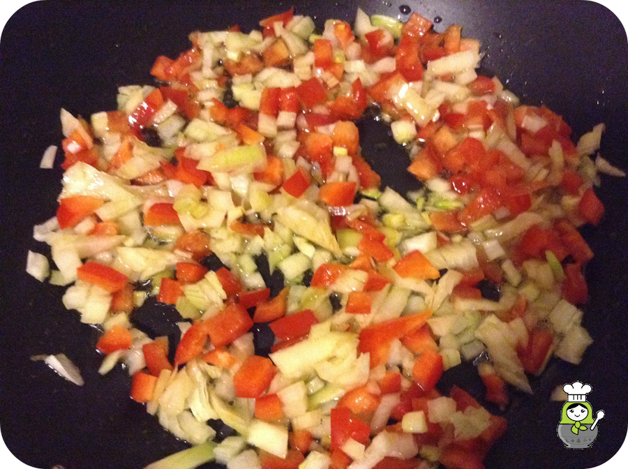 Primero vamos a preparar el relleno. Para ello picamos en juliana fina la cebolla y el pimiento y los sofreímos en un poco de aceite hasta que la cebolla esté transparente y el pimiento blandito.