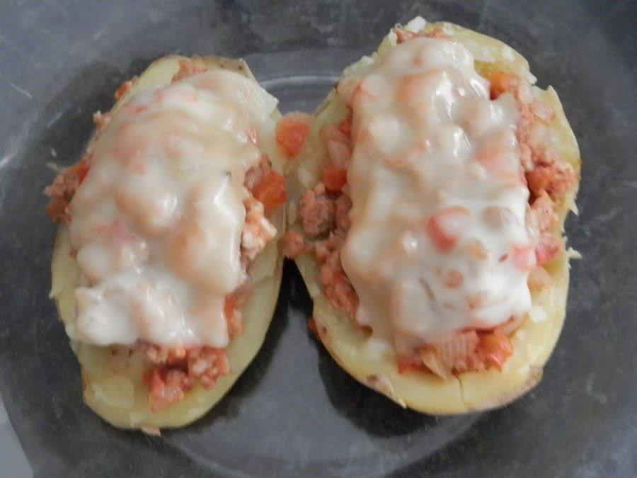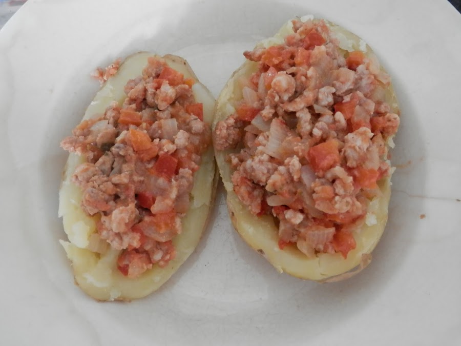 Rellenamos con la mezcla de carne y verdura el hueco de la patata.