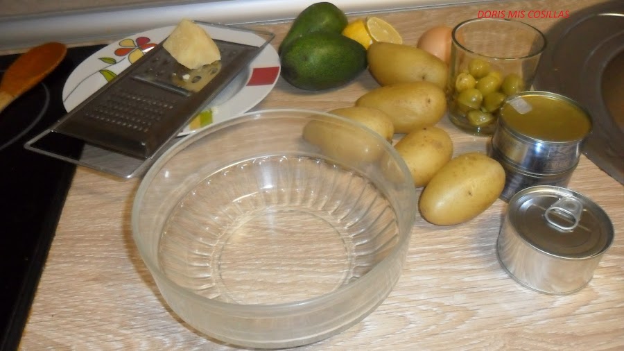 Aparte en un bol, trituramos la carne de las patatas, el huevo muy picadito y las aceitunas. Con un tenedor trituramos la carne del aguacate, exprimimos el limón y lo rociamos para que no se ennegrezca.