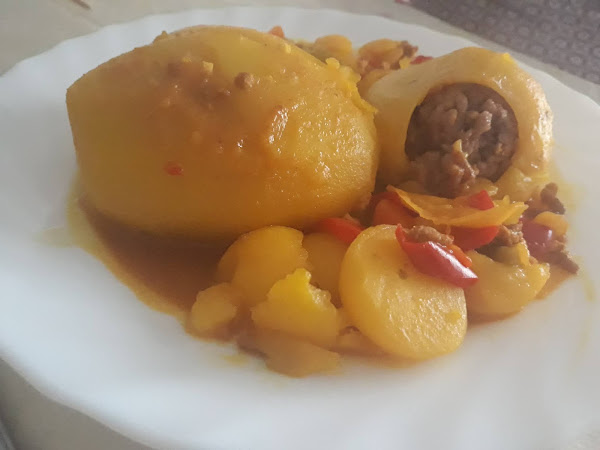 3º) Para preparar las patatas, se pelan y se vacían, se rellenan con la carne, cerrándola con uno de los trozos de patata vaciado, y es mejo clavarle un palillo para que no se abra