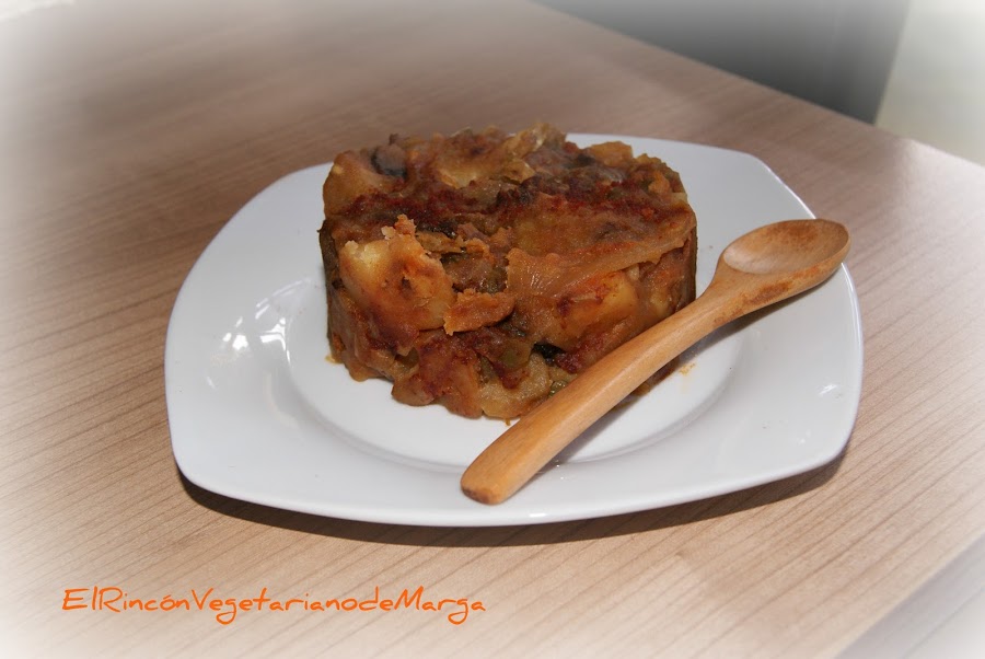 En una cazuela honda de barro ponemos un dedito de aceite de oliva y dejamos que se vaya calentando, mientras cortamos en trozos grandes los pimientos verdes, la cebolla y el ajo. En el aceite añadimos las hojas de laurel y los ingredientes (exceptuando las patatas), lo sofreímos unos minutos. Pelamos las patatas y las cortamos en cuartos. Las añadimos en la cazuela y las cocemos un minuto, en este momento incorporamos los dos vasos de caldo vegetal (el caldo debe cubrir las patatas, no más), lo dejamos cocer hasta que veamos que se ha evaporado el caldo y que las patatas se han medio deshecho y queda una pasta cremosa. Se debe remover continuamente ya que sino se nos quema en la parte inferior. Si las patatas todavía no están bien cocidas, añadimos un vaso más de caldo vegetal y lo cocemos hasta que se evapore. En este punto añadimos una cucharadita de pimentón de la vera y lo integramos bien con todos los ingredientes.