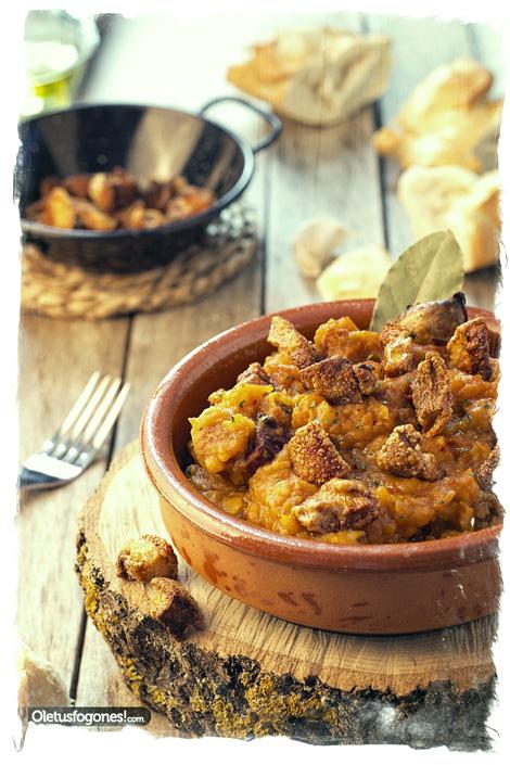 Por último los freiremos en una sartén con un chorrito de aceite hasta que estén bien crujientes. Los reservamos en un plato con papel absorvente para quitar el aceite sobrante y añadimos la mitad a la olla para que se mezclen con la patata y así potenciar más aún el sabor. Los restantes los utilizaremos para la hora de emplatar colocarlos sobre las patatas.