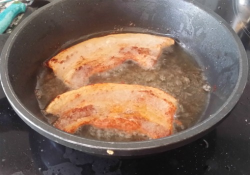 a, tocino o papada, hasta que esté crujiente. Quita de la sartén.