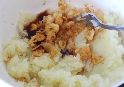 y viértelo sobre las patatas trituradas y revuelve bien.