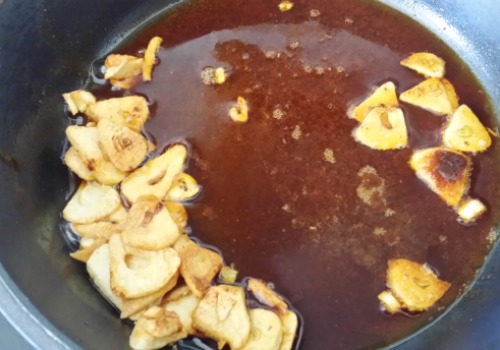 Pela los ajos y córtalos en filetes. Ponlos en la sartén que has usado para la carne y fríelos hasta que estén ligeramente dorados.