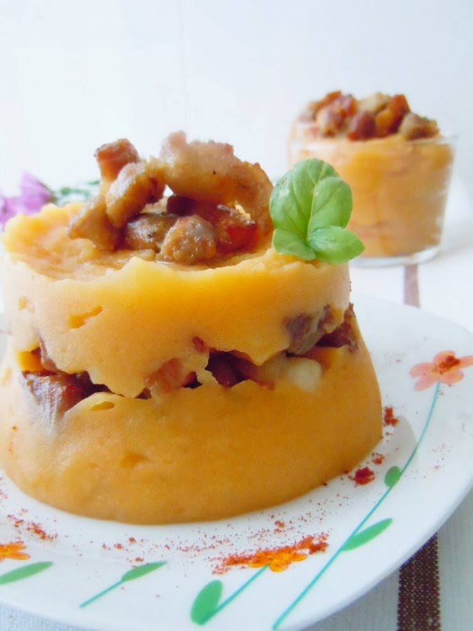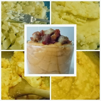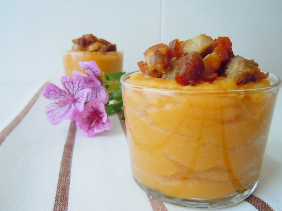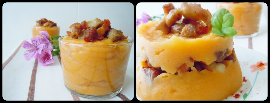 Para servirlo yo lo he puesto en vasitos, pero os vale cualquier tipo de recipiente. La cuestión es que os quede como un montañita de patata y los trocitos de panceta en la cima. Aquí 2 formas de servirlo.