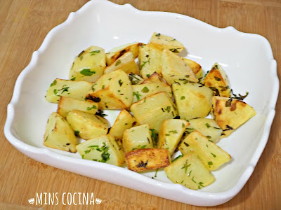 - Cuando estén listas, las colocamos en una fuente o cuenco y las servimos inmediatamente. Ya veréis qué ricas quedan. Tiernas por dentro y crujientes por fuera. Parecidas a las patatas fritas pero menos grasientas y con más sabor tostado. Y con el aroma de las hierbas... uff! Buenísimas!