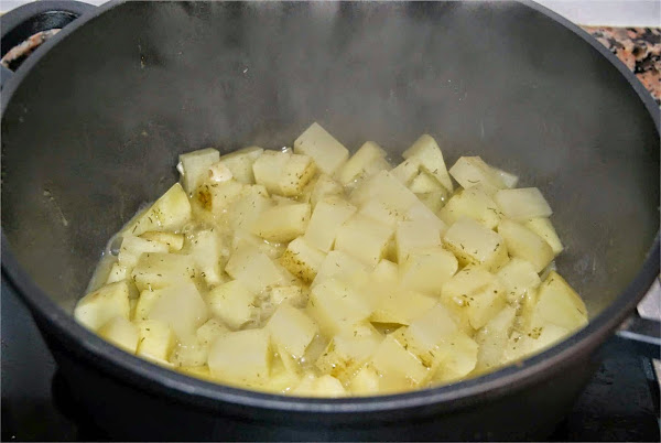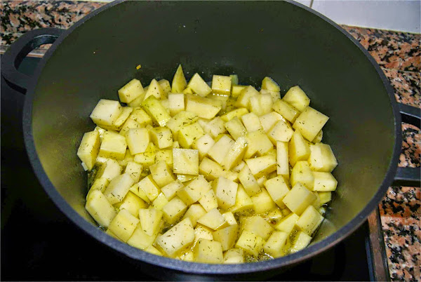 Pelamos las patatas, las cortamos en dados y las dejamos en agua para que desprendan parte del almidón mientras preparamos el resto de la receta.
