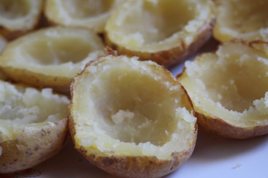 4) Una vez tibias las patatas, cortarlas al medio y ahuecar, la pata que retiramos la ocuparemos para agregar al relleno. No lo tires.