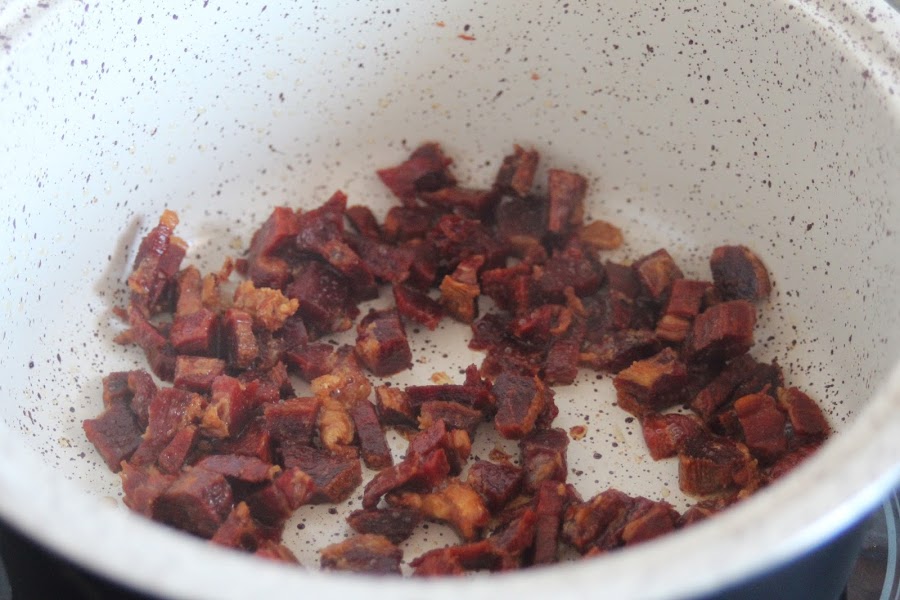3) Poner al fuego lento el jamón serrano, una vez dorado, retirar del fuego y reservar.
