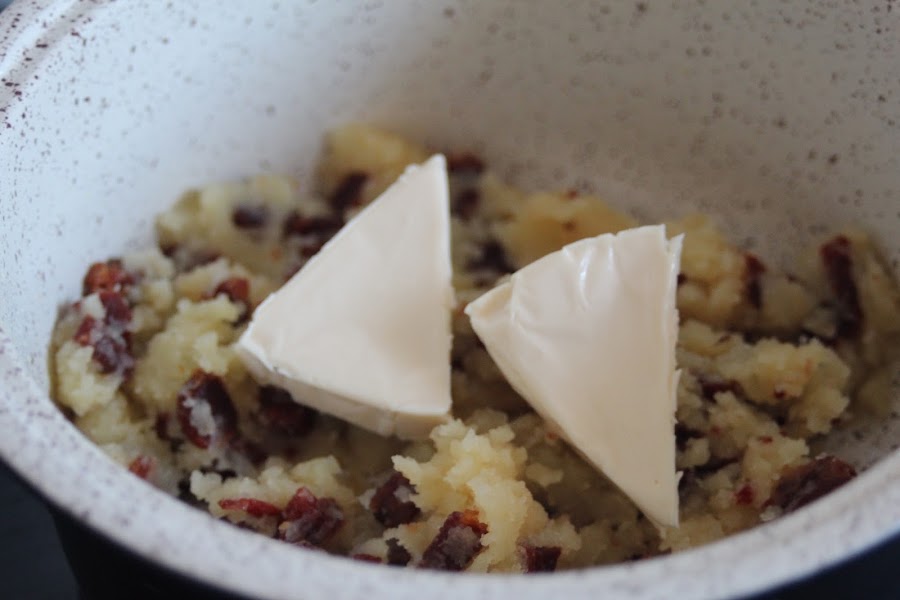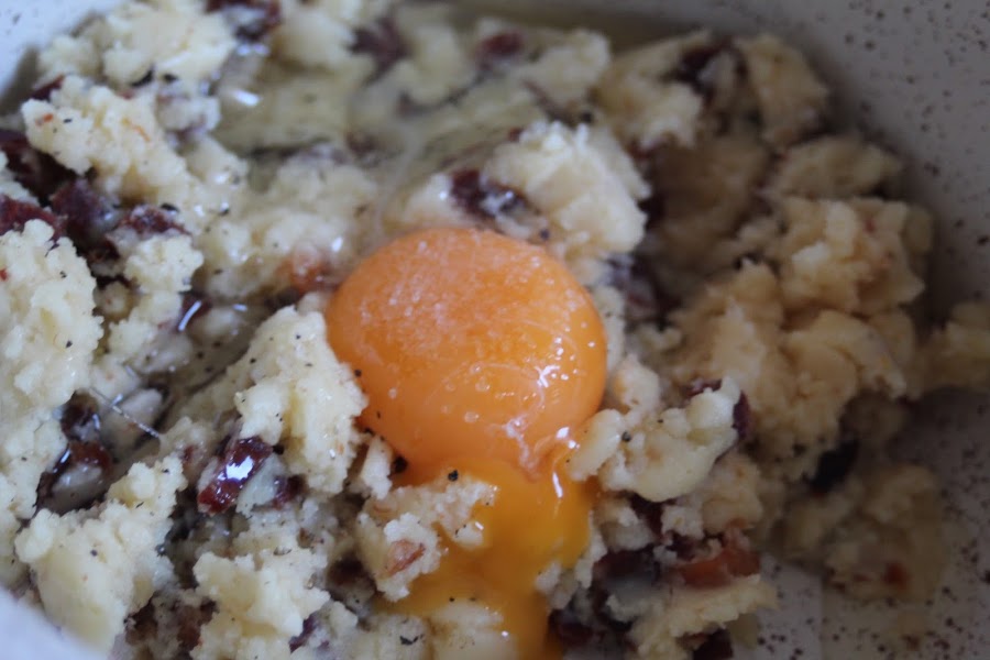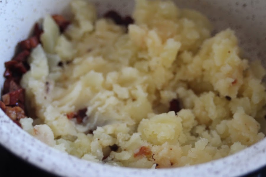 5) Vamos a incorporar el relleno que retiramos de las patatas y lo mezclaremos con los trocitos de jamón. Agregamos sal y pimienta a gusto, no olviden que el jamón ya le dará un toque, no abusen de la sal.