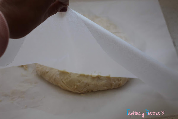 Sacamos la masa, hacemos una bola y estiramos entre dos papeles vegetales dejando un grosor de medio centímetro aproximadamente. Si vemos que está algo blanda, la metemos en la nevera un ratito.