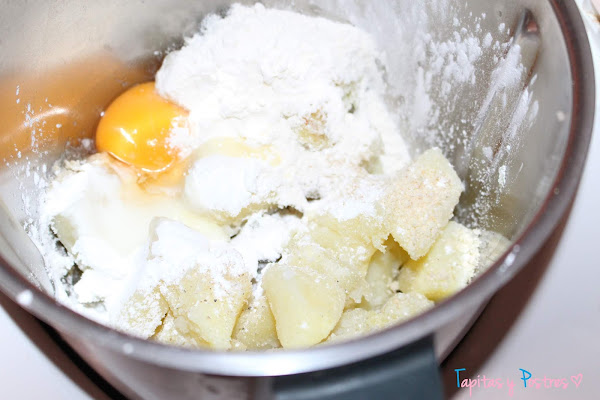 Ponemos las patatas ya frías en el vaso de la thermomix y agregamos el huevo, la maicena, el queso, la sal y la pimienta. Mezclamos 15 segundos a velocidad 4 y luego amasamos un minuto a velocidad espiga.
