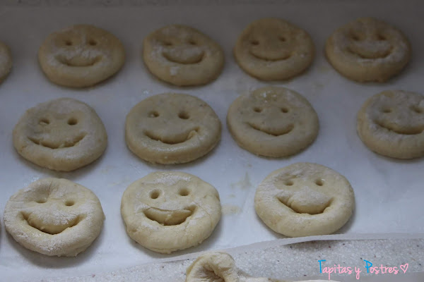 Con un vaso pequeño cortamos los círculos que formarán las caritas. Los restos de masa, se pueden volver a amasar y hacer más caritas.