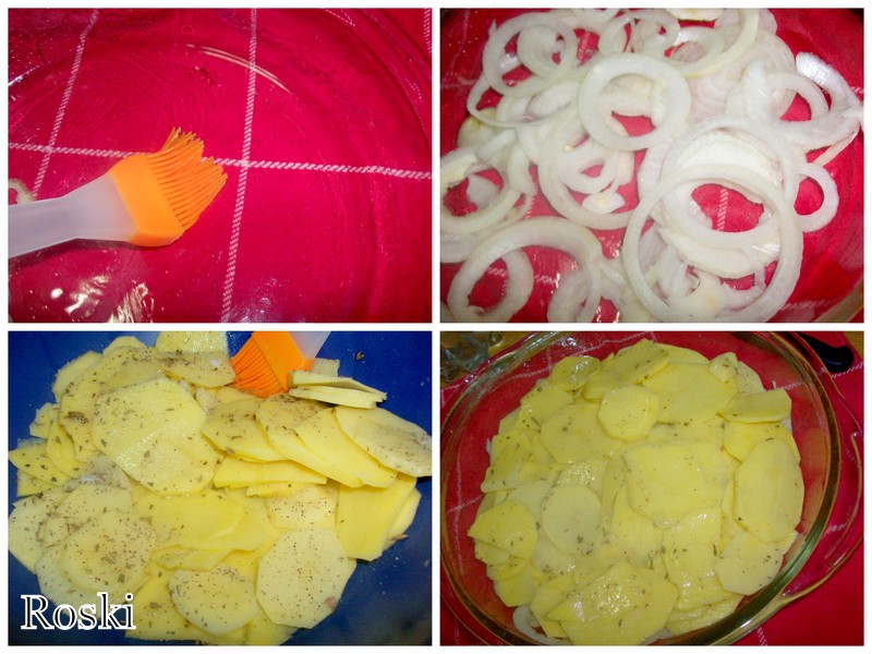 En un cuenco colocamos las patatas cortadas y le agregamos el orégano,la sal y con el spray o con un pincel untado en aceite vamos untando las patatas.