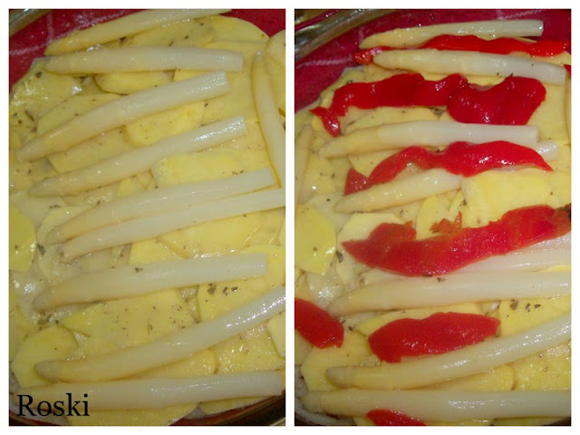 Encima de la cebolla las patatas, y luego repartimos los espárragos, a continuación ponemos el pimiento rojo en tiras.