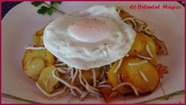 Servimos las patatas con las anguriñas y ponemos encima los huevos, los rompemos y damos unas vueltas para que se integre todo y se mezclen los sabores.