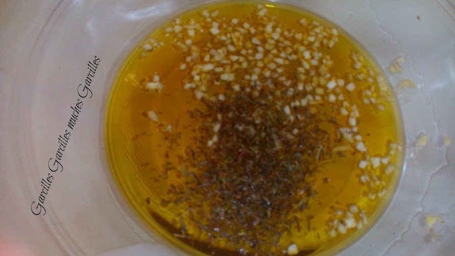 Poner en un bol grande el aceite, el ajo, la sal, la pimienta y el tomillo