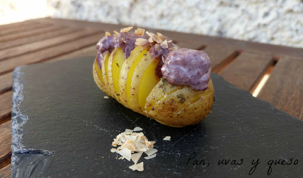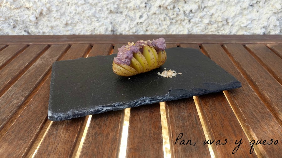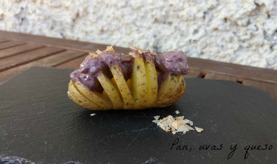 Escogemos las patatas que tengan un tamaño similar para que estén listas a la vez. Las lavamos bien ya que vamos a asarlas con piel. Hacemos unos cortes a las patatas para que se abran como un abanico, con mucho cuidado de no llegar al fondo de la patata. Para evitar cortar demasiado (¡me ha pasado!) podemos ayudarnos de unos palos de brocheta. Ponemos la patata en la tabla de cortar y la rodeamos con los palos, de manera que el cuchillo tropieze con ellos antes de llegar al final de la patata.