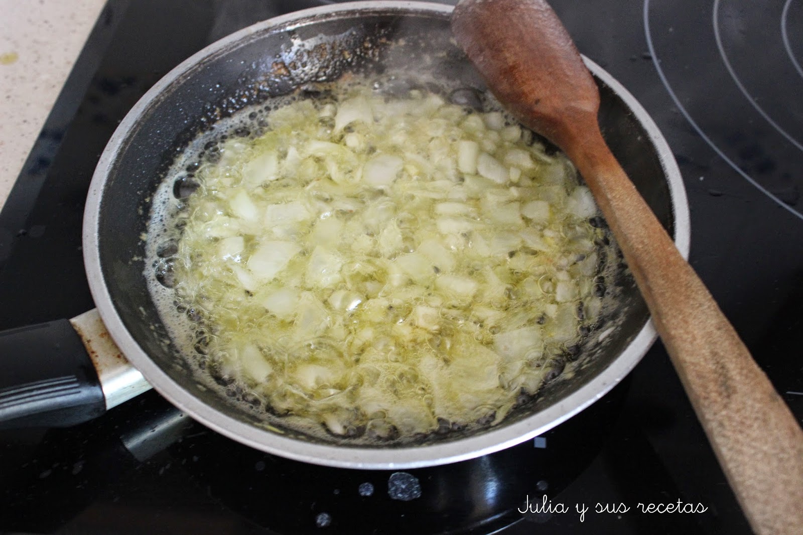 En una sartén ponemos 50 g de la mantequilla y sofreímos la cebolla y el ajo.