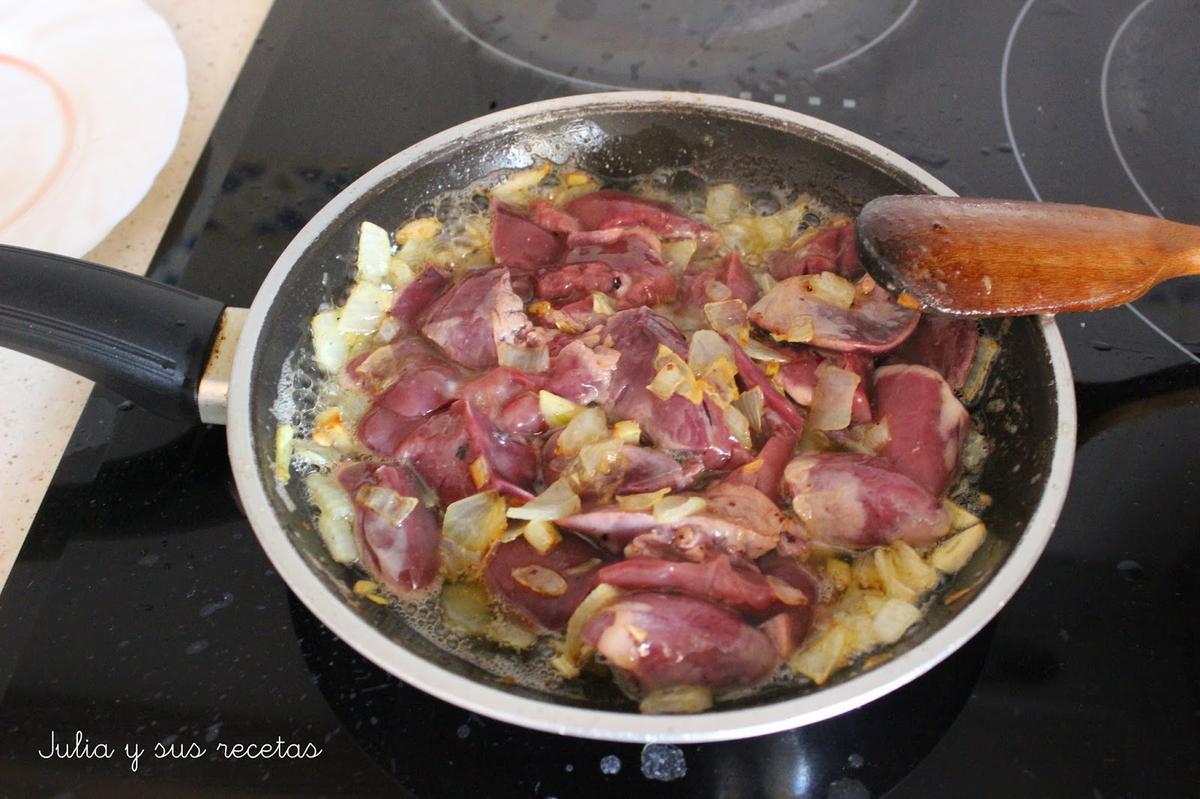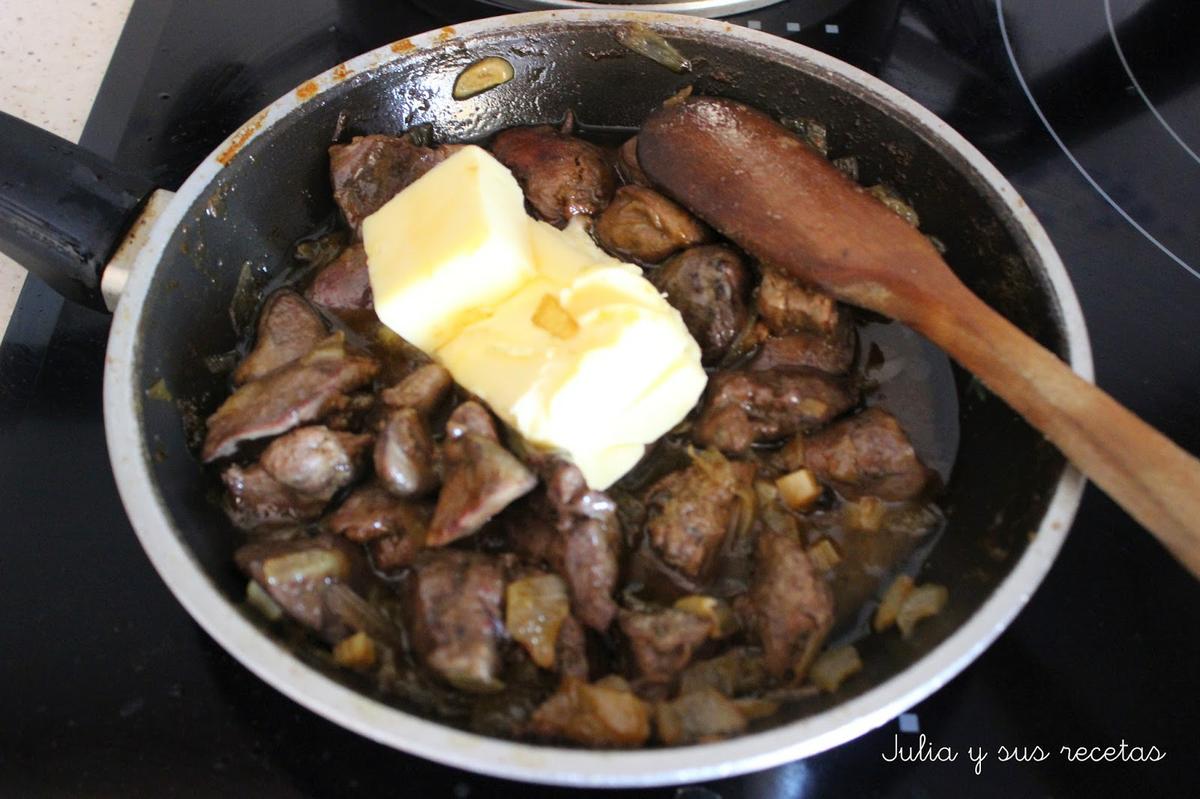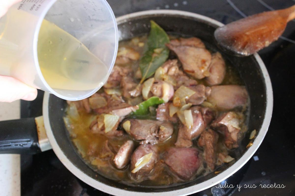 Añadimos los higaditos, sal y pimienta al gusto y las hojas de laurel. Dejamos que se hagan unos minutos.