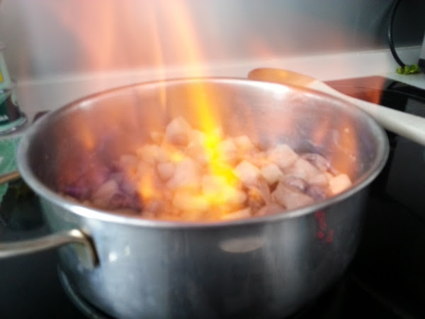 4. - Cuando esté templado, apartamos del fuego, le prendemos fuego y lo echamos sobre los higaditos, para flambearlos, removemos muy despacio para que no se apague.