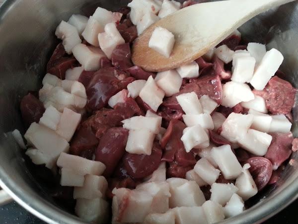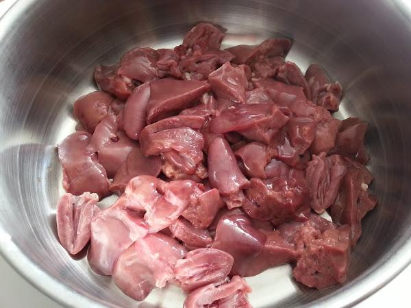 1. - Lo primero que haremos será limpiar los higaditos, quitándole las partes grasas, lo troceamos y lo vamos poniendo en una cacerola.