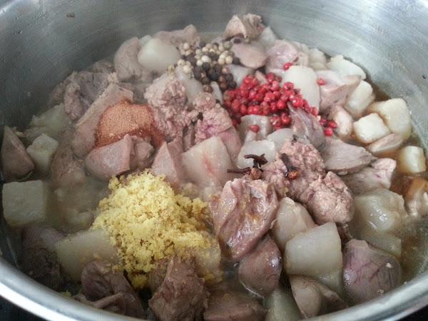 5. - Cuando el fuego se apague, echamos el resto de ingredientes, menos la nata (crema de leche), en la cacerola, y lo dejamos a fuego medio bajo, unos 15-20 minutos, removiendo de vez en cuando.
