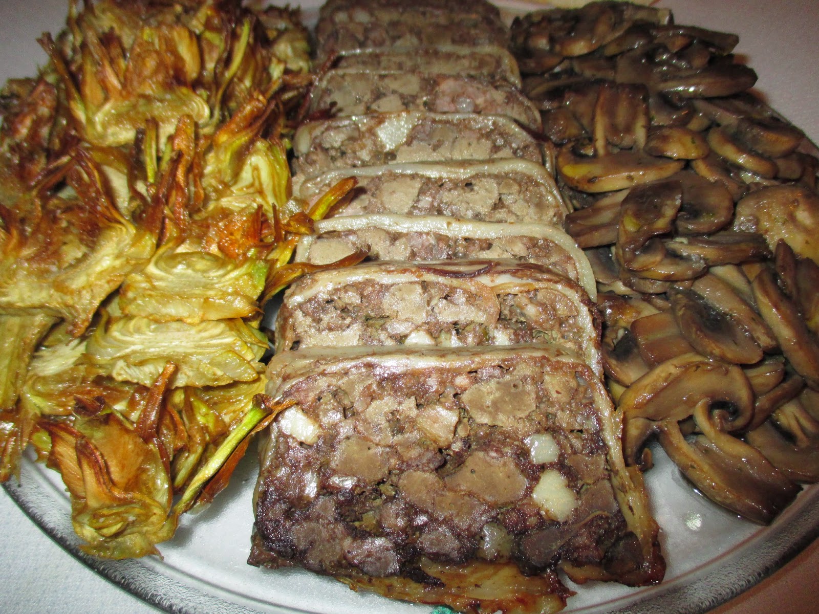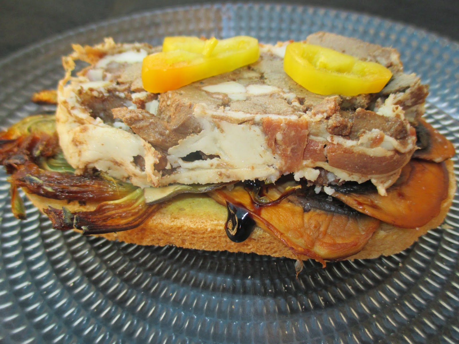 En canapé untando el pan con una capa fina de mostaza, unos champiñones y unas laminas de alcachofa con unas gotas de reducción de vinagre de Módena, el pate y unos trocitos de guindilla picante Mmmmmmm..... delicioso.