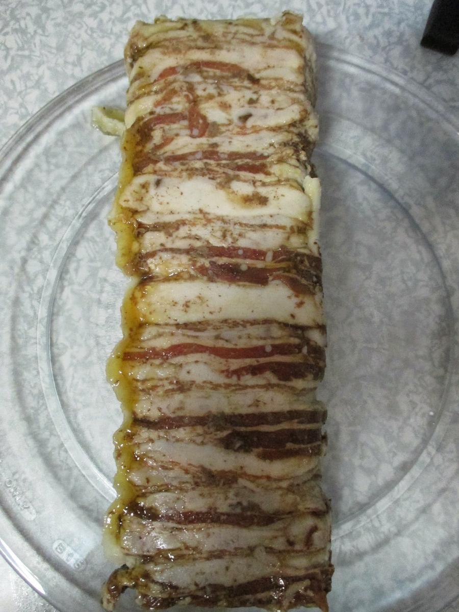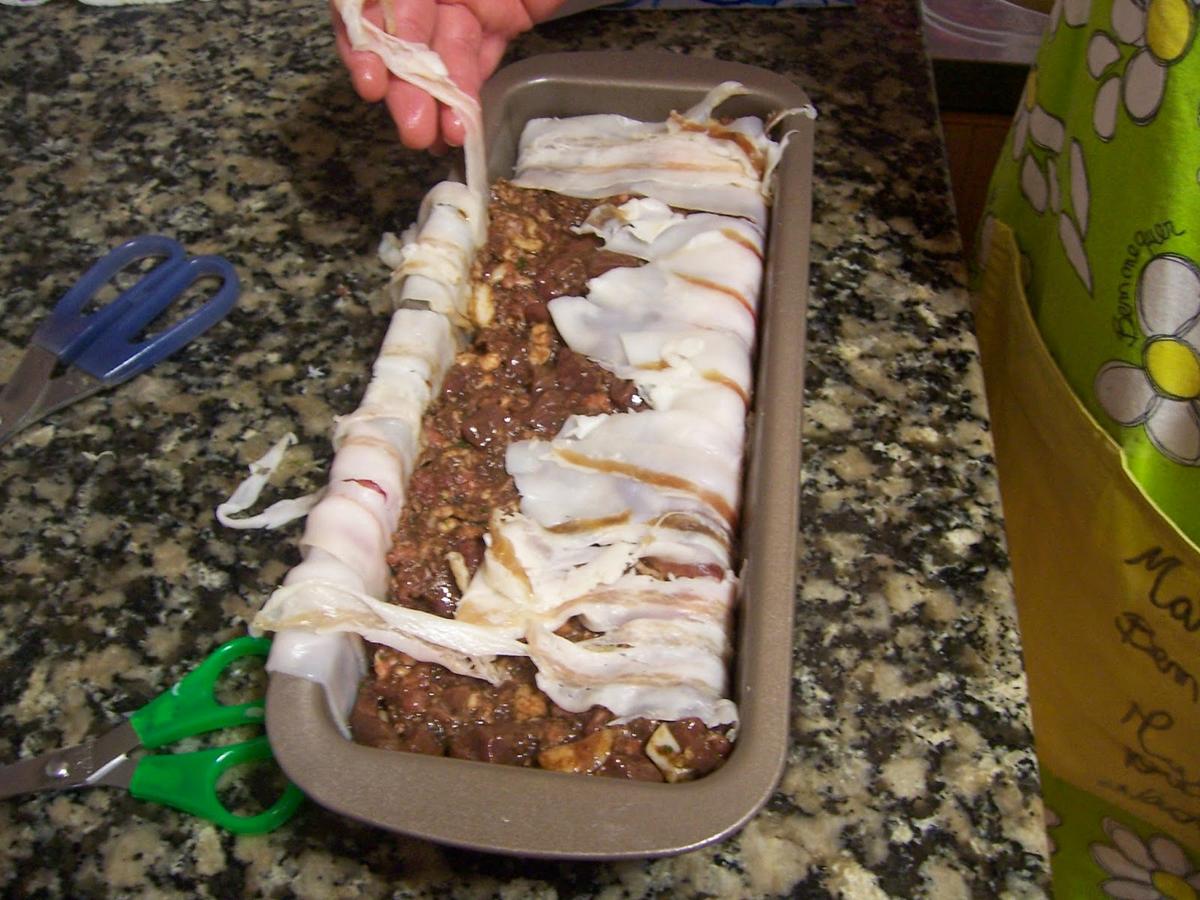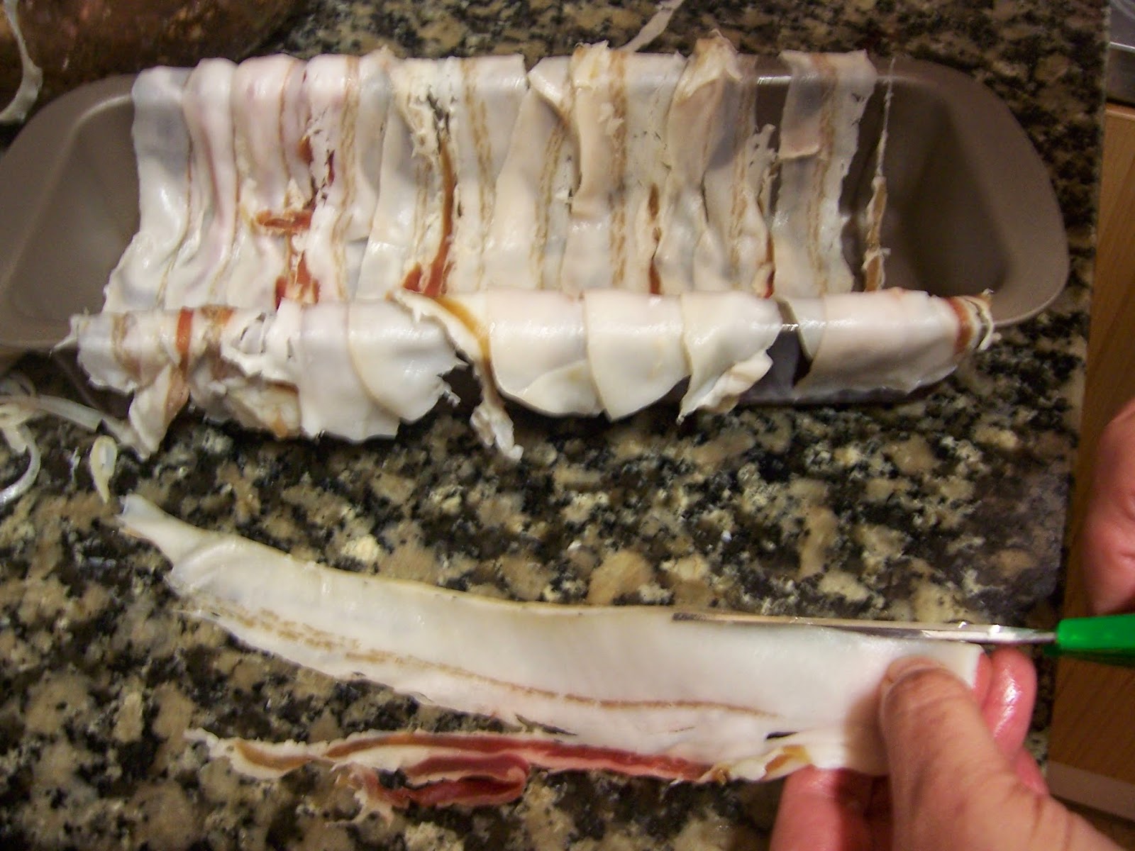 Forramos un molde con las lonchas de panceta y añadimos la mezcla, cubrimos con la panceta.