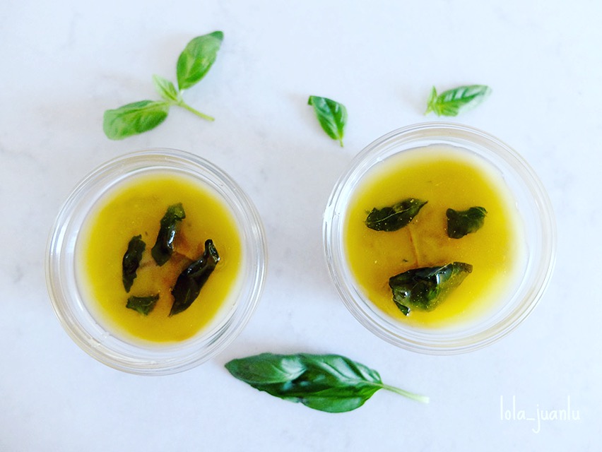 Sacamos el paté de la nevera, colocamos las hojas de orégano cocinadas previamente en la parte superior del paté frío y, a continuación, vertemos la mantequilla clarificada hasta que cubra el paté y las hojas de orégano.