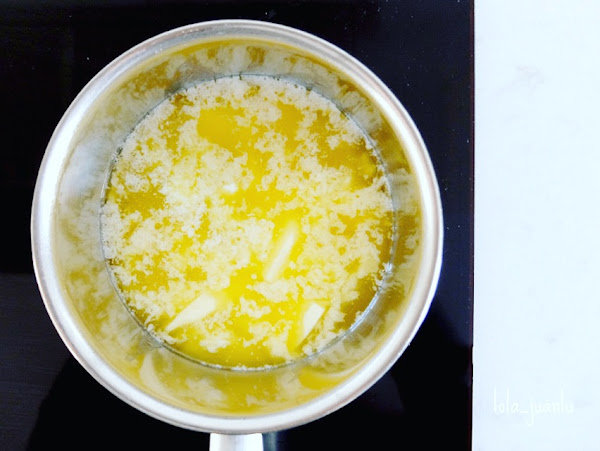 Nos ponemos con la mantequilla clarificada y para ello, colocamos 250 g de mantequilla en una sartén a fuego lento y dejamos que se derrita lentamente hasta que se separe la grasa de la mantequilla del suero. Dejamos reposar y a continuación, usamos una cuchara para quitar la grasa de la mantequilla que queda en la parte superior y reservamos el suero.