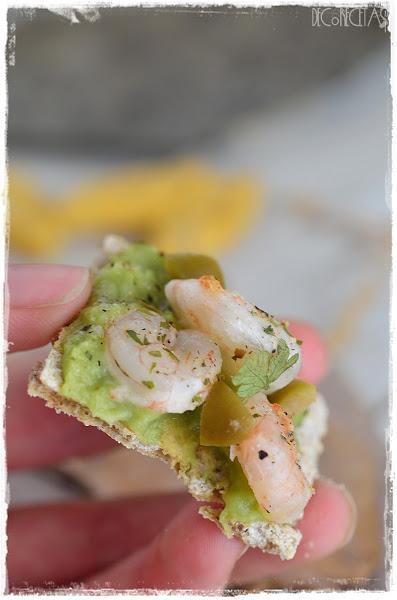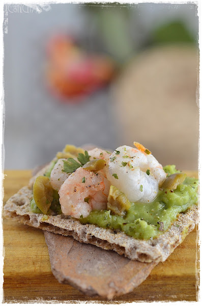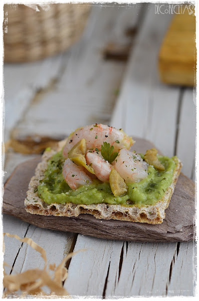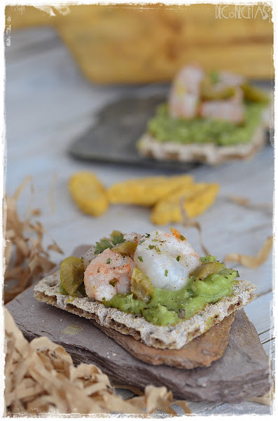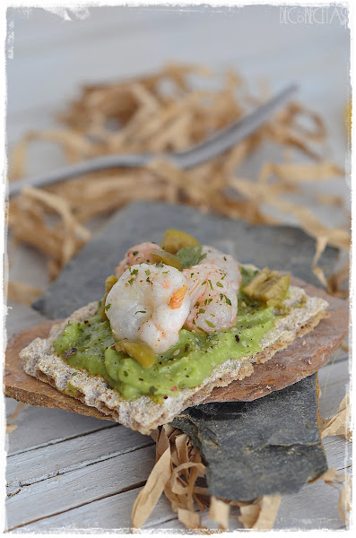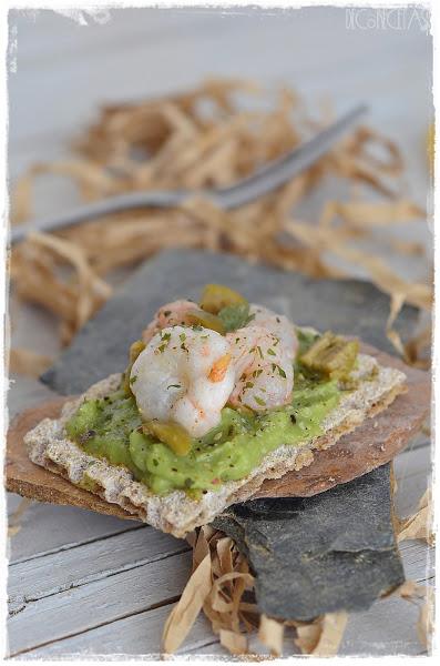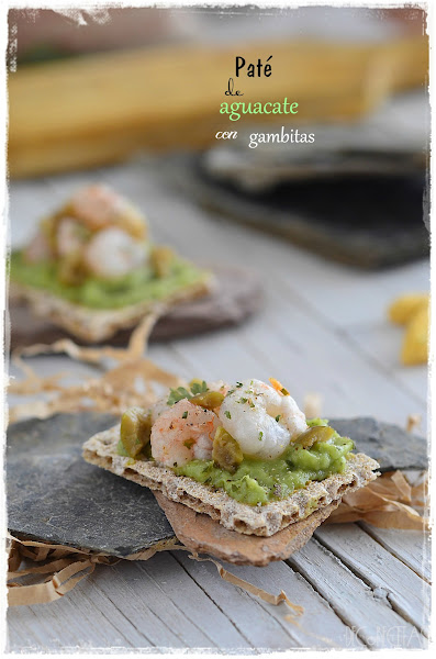 El paté se elabora en un momento triturando conjuntamente 1 aguacate, una lata de anchoas escurridas, 4 aceitunas y un chorrito de limón con sal y pimienta. Se pasan unos langostinos o gambas a la plancha y se ponen encima de una tosta de pan.