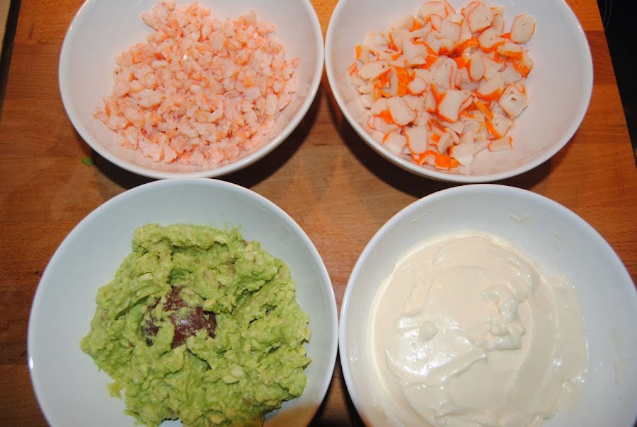 Vamos a empezar la receta organizando los ingredientes. Para ello pelamos y picamos los langostinos y el surimi en trozos muy pequeñitos. Por otro lado, preparamos una mahonesa casera que esté bastante espesa (nos va a servir para dar consistencia a la crema) y "alegre", es decir, que tenga mucho sabor. Es importante que la mahonesa esté sabrosa porque el aguacate es un fruto muy soso y necesitamos realzar su sabor. Si no sabéis hacer una mahonesa casera no os preocupéis, más adelante dedicaremos un post del blog a cómo prepararla.