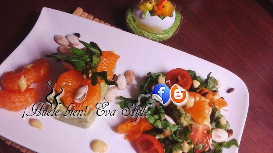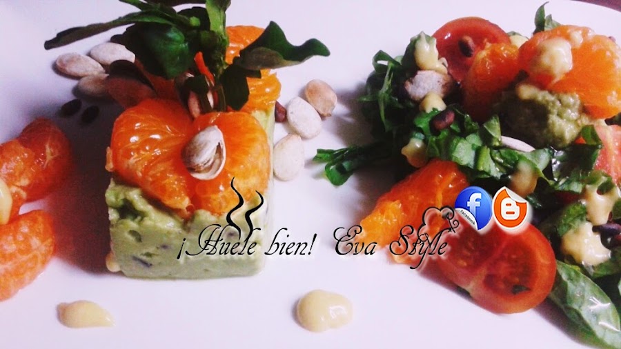 Esta semana empezamos con un paté de aguacates, servido con una ensalada de mandarinas, con pipas de calabazas y piñones.