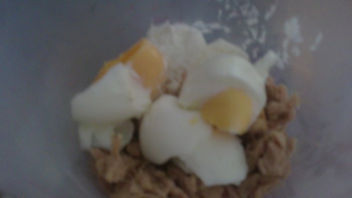 Necesitamos el atun y las anchoas bien escurridos, que no quede nada de aceite, las ponemos en el vaso de la batidora junto con el huevo cocido y el queso.