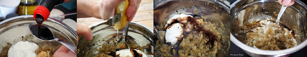 Añadir los aderezos y condimentos: los ajos, previamente chafados, el yogur, la melaza de granada, el azúcar, el zumaque, el zumo de limón, sal, pimienta negra y aceite de oliva. Mezclar bien hasta que los todos los ingredientes queden integrados. Probar y rectificar de alguno si es necesario.