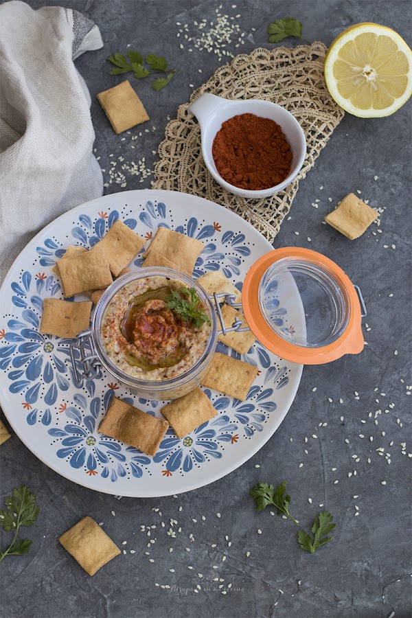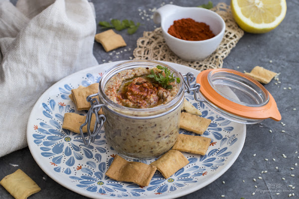 El Baba Ghanoush es una pasta a base de puré de berenjena típica de la cocina árabe y mediterránea. Su principal ingrediente es la berenjena asada, junto con el ajo, zumo de limón, sésamo y comino. Realmente resulta un paté delicioso que, untado con pan pita, como se hace tradicionalmente, o, como he hecho yo, con estas regañás, gustará a todos.