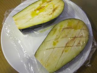 Hacemos unos cortes a la berenjena, salpimentamos, añadimos un hilo de aceite y hacemos al microondas tapadas con film .