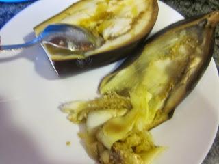 Cuando entibie, nos ayudamos con una cuchara para sacar la carne de la berenjena, los cortes que hicimos antes nos facilita esto.