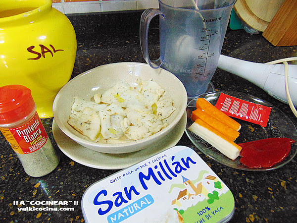 Colocamos en el vaso de la batidora el pescado, el surimi troceado, el pimiento y la cucharadita de ketchup.
