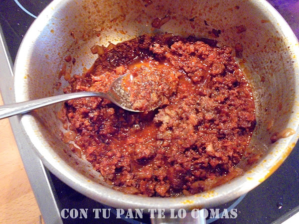 Si el chorizo es más duro como el que yo he puesto y no lo has podido desmenuzar, en este momento lo pasamos al vaso de la batidora y lo trituramos un poco. Si el chorizo es más fresco no hará falta.