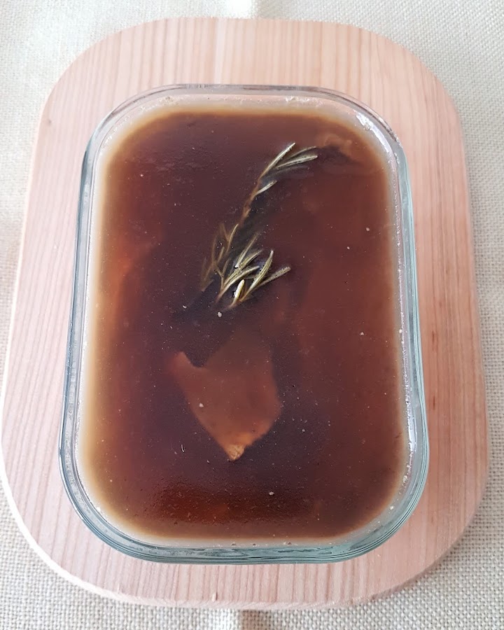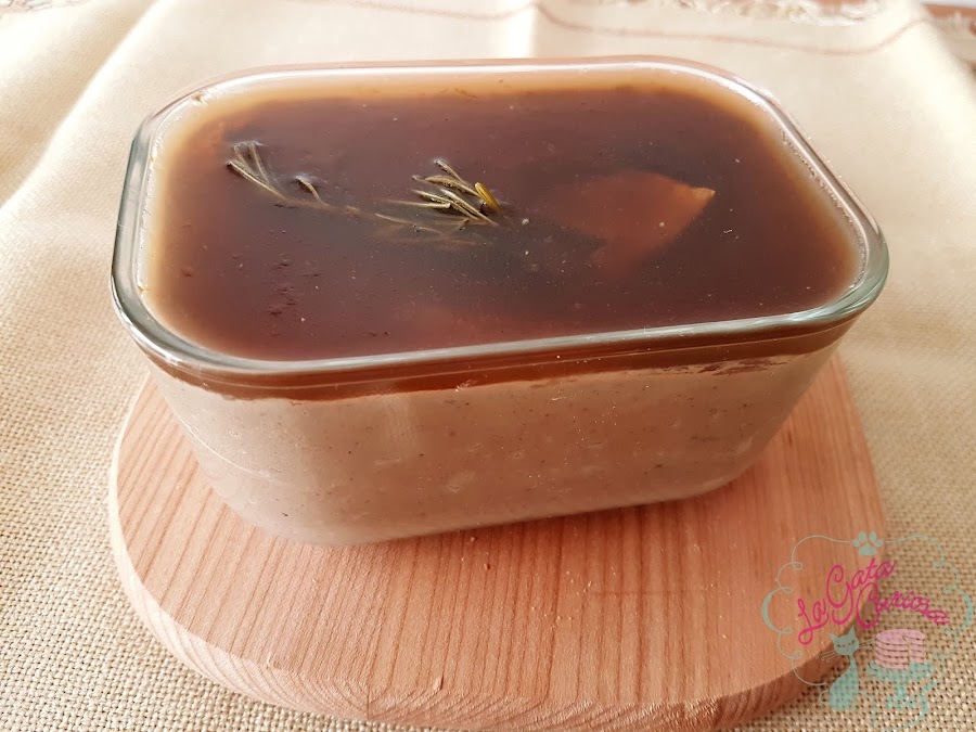 Colamos el agua de hidratar los boletus en un cazo, añadimos un poco de sal y pimienta, también la ramita de romero, dejamos reducir un poco, añadimos la hoja de gelatina que habremos hidratado en agua fría, cuando esté bien disuelta dejamos que la mezcla esté casi fría y vertemos sobre nuestro paté para crear una capa protectora. Decoramos con la ramita de romero.