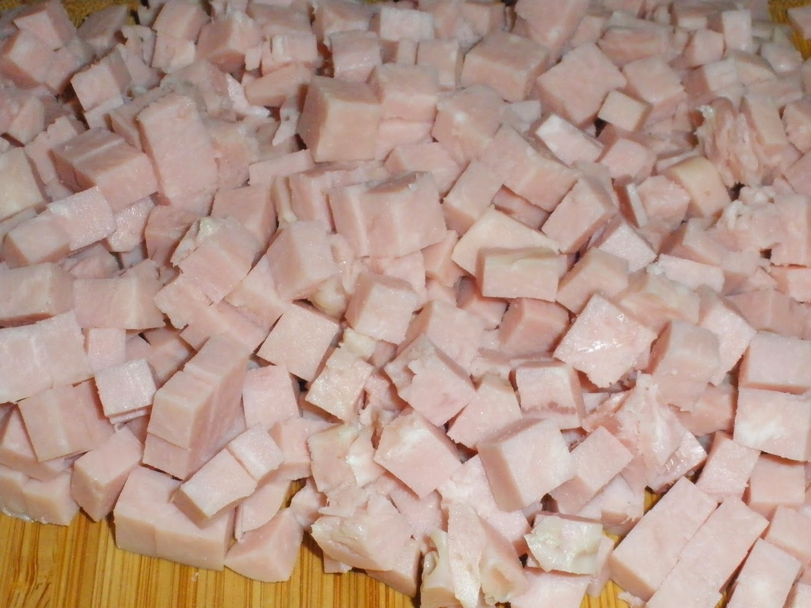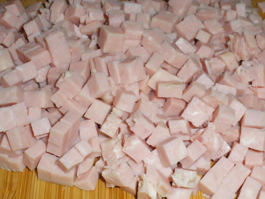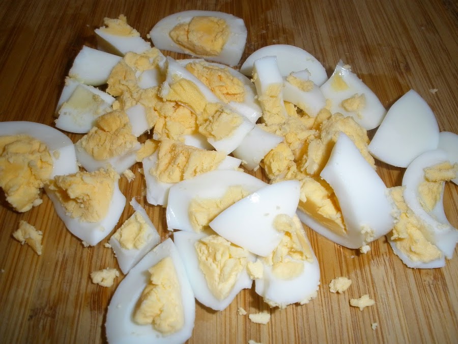 Pica la pieza de Jamón York en cuadraditos lo más pequeños posible, también puedes utilizar jamón en lonchas si es lo que tienes en la nevera, simplemente hay que picarlo lo mejor posible para que al pasarlo por la batidora sea más fácil. Cuece dos huevos y pícalos en trozos también lo más pequeños posible.